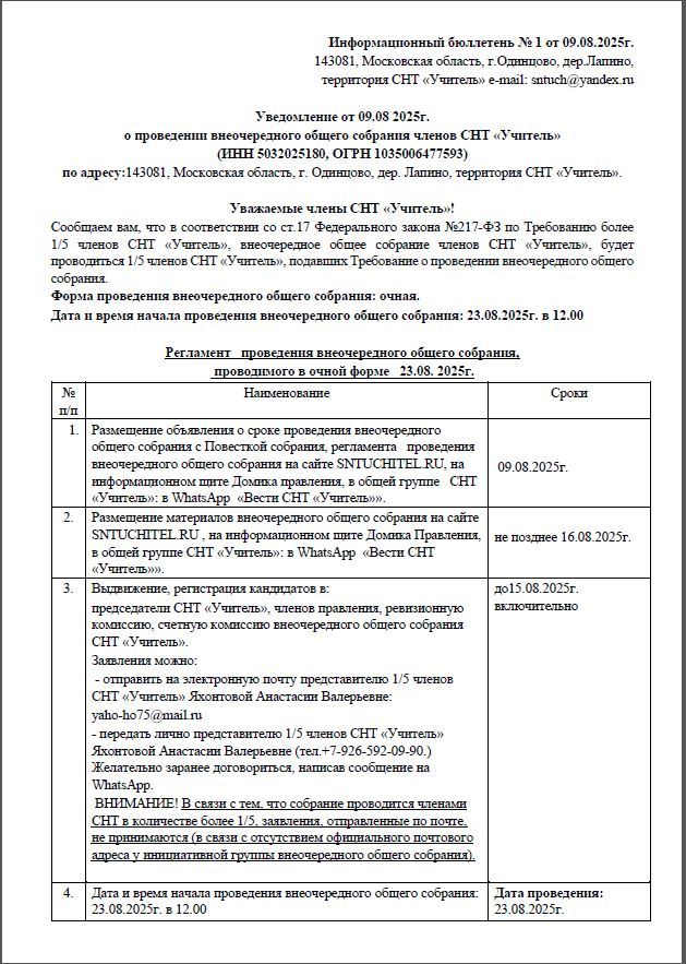 Дополнительная информация указана в Уведомлении от 09.08.2025г. о проведении внеочередного общего собрания по инициативе более 1/5 членов СНТ «Учитель», размещенном на сайте SNTUCHITEL.RU, на информационном щите Домика Правления, в общей группе СНТ «Учитель» в WhatsApp «Вести СНТ «Учитель».