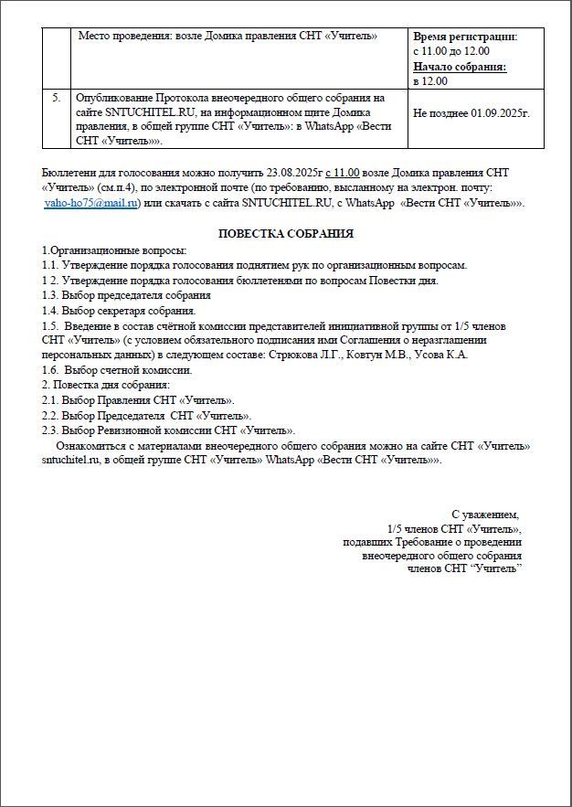 3. Всем членам СНТ «Учитель» принять участие во внеочередном общем собрании, которое состоится 23.08.2025г. в 12.00 возле Домика правления СНТ «Учитель» (начало регистрации с 11.00 до 12.00), или выдать Доверенность на право представления ваших интересов на внеочередном общем собрании членов СНТ «Учитель» доверенному лицу.