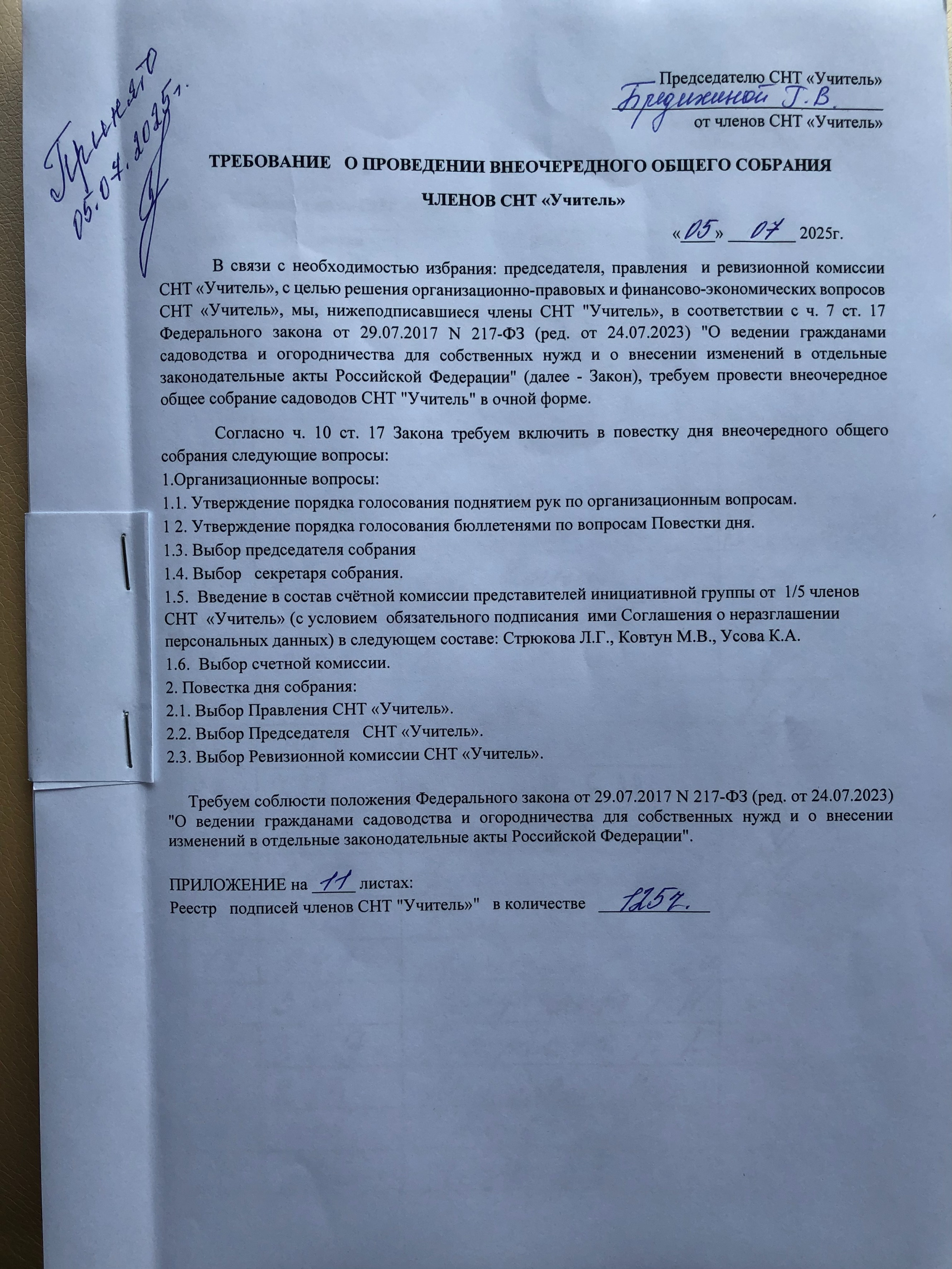 С целью дальнейшего решения организационно-правовых и финансово-экономических вопросов СНТ «Учитель», члены товарищества в количестве более одной пятой 05.07.2025г. вручили Требование от 1/5 членов СНТ «Учитель» о проведении внеочередного общего собрания членов СНТ «Учитель» в очной форме председателю СНТ «Учитель» Бредихиной Г.В. (исполняющей обязанности председателя СНТ «Учитель» по выписке из ЕГРЮЛ).