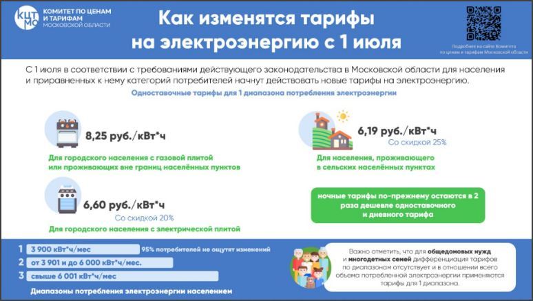 ВНИМАНИЕ! С 1 июля 2025г. в соответствии с требованиями действующего законодательства в Московской области для населения и приравненных к нему категорий потребителей начнут действовать тарифы на электроэнергию, дифференцированные по объемам потребления электроэнергии и времени суток. Дифференцированные тарифы утверждены Распоряжением Комитета по ценам и тарифам Московской области от 10.12.2024 № 270-Р.